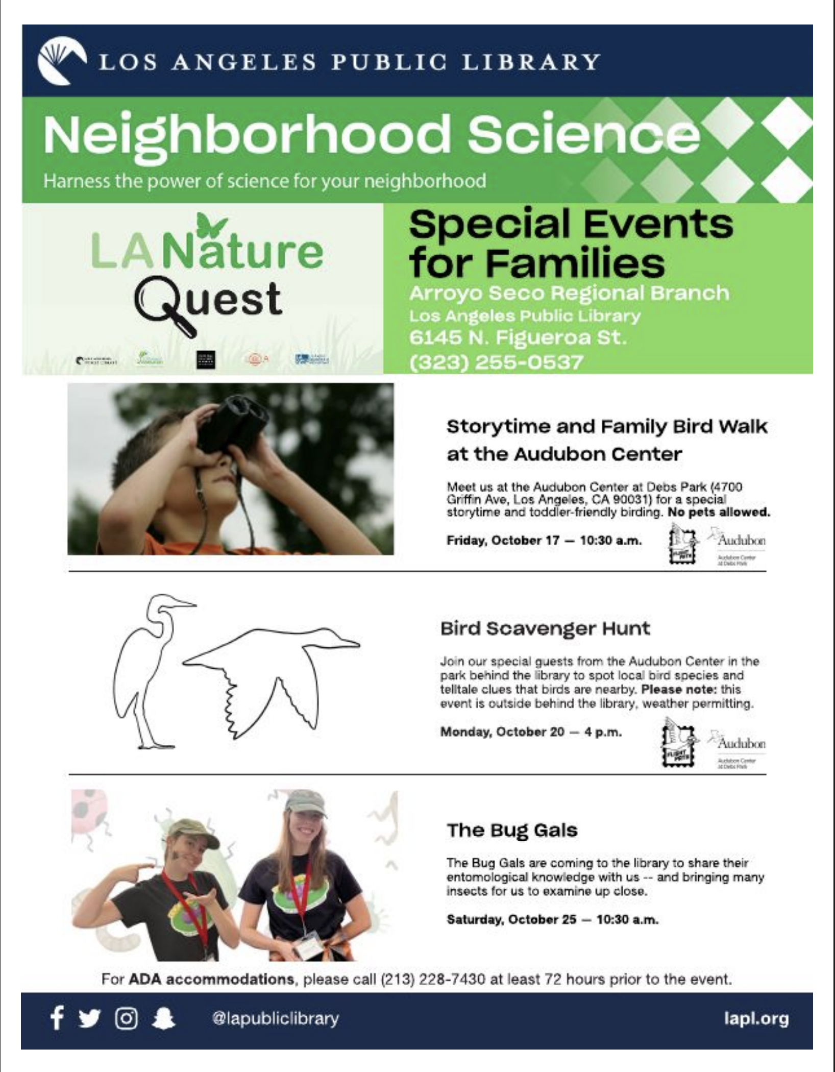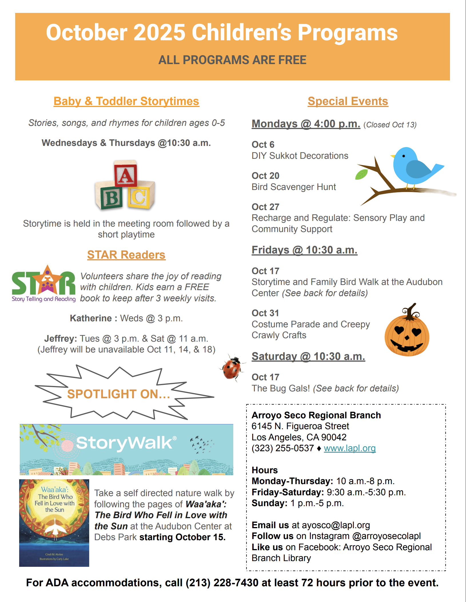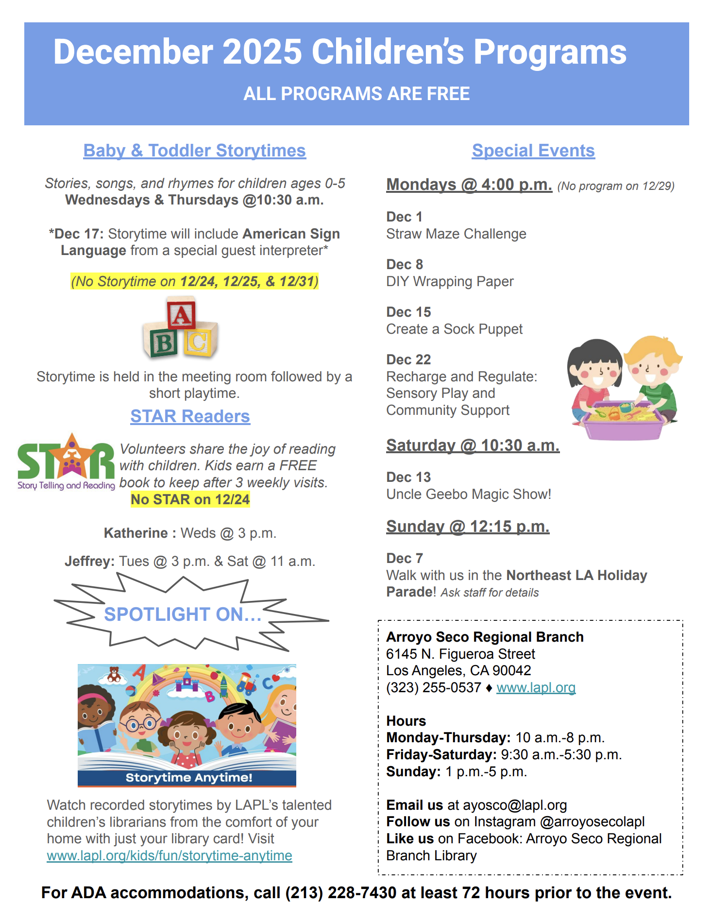 The Arroyo Seco Regional Branch Library serves the Community of Highland Park. We have a large, general collection of books, magazines, cds, & dvds for all ages and interest levels, with a wide array of programming for all ages. In addition, public use computers and computer classes are available. Our friendly, knowledgeable staff is willing to help you with your information http://www.lapl.org/branches/arroyo-seco